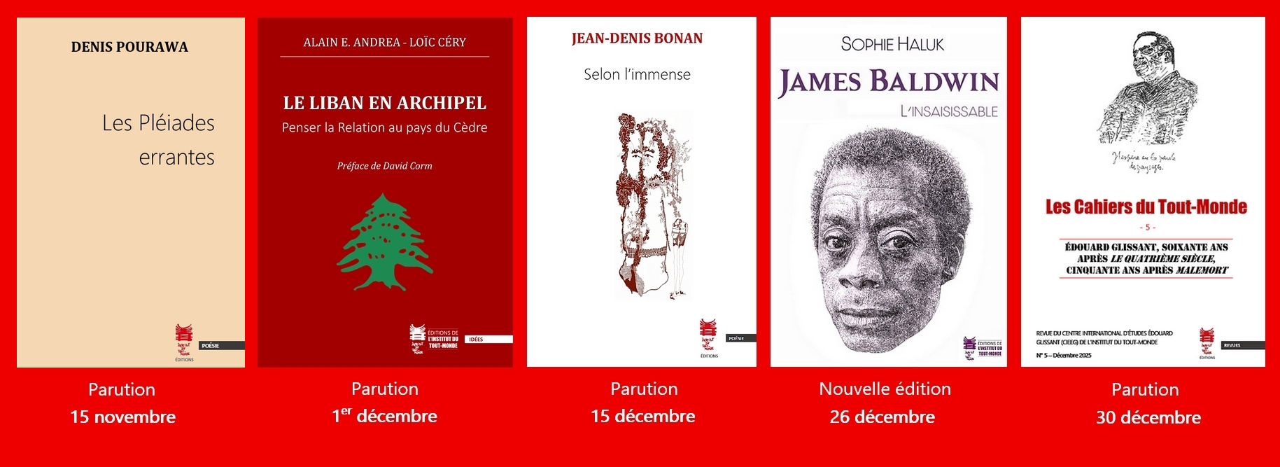 Depuis notre lancement en 2020, nous vous proposons un certain nombre de titres issus de nos activités de recherche de ces dernières années et de nos actions plus récentes. Les actes des colloques internationaux marquants que nous avons organisés en 2012, 2015 et 2019, les premiers titres de notre collection d’essais, la création de la revue Les Cahiers du Tout-Monde, organe critique du CIEEG (Centre international d’études Édouard Glissant que nous avons fondé au sein de l’ITM en 2018) : telles seront les premières pierres des Éditions de l’Institut du Tout-Monde. Les projets éditoriaux ne manquent pas, par ailleurs. Nous tâcherons de vous informer en temps réel des évolutions de nos différents projets en cours. Les premiers mois de notre activité seront en tout cas bien remplis, et les publications se suivront à intervalles rapprochés. Si vous souhaitez vous tenir régulièrement informés de nos nouveautés, nous vous recommandons de vous inscrire à la newsletter de l’Institut du Tout-Monde.