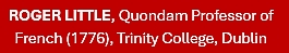 Roger Little a occupé la chaire de Français (créée en 1776) de Trinity College, Dublin et y a dirigé la section d’études françaises. Il a fondé en 2001 la collection « Autrement Mêmes » aux Éditions L’Harmattan. Ses axes de recherche portent sur la représentation littéraire du Noir et la poésie depuis Rimbaud. Il a profondément marqué l’étude de la poésie de Saint-John Perse dès les années soixante-dix.